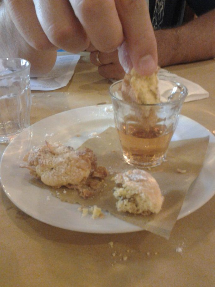 Já para a sobremesa, não esqueça de pedir o Vin Santo con cantuccini, um biscoito de amêndoas um pouquinho duro, que deve ser molhado no vinho doce que o acompanha. huuum… delicioso!