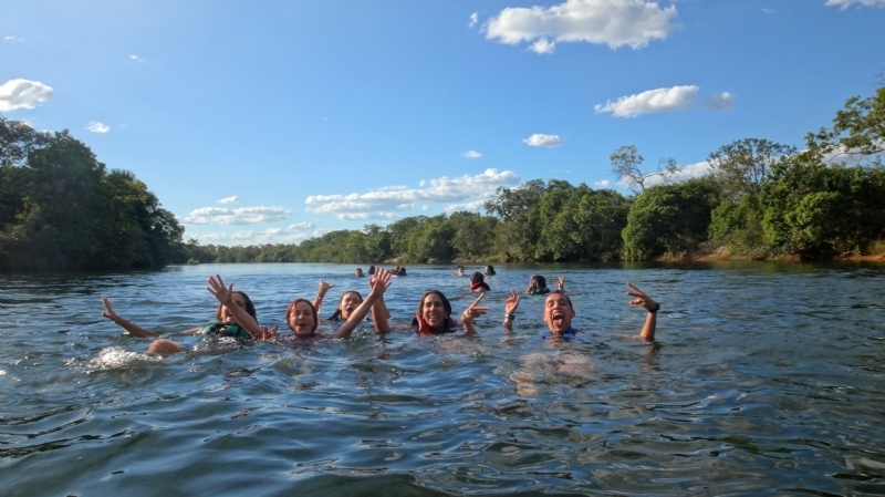 A tarde tivemos o dia livre para descansar na rede, conversar com o grupo e no finalzinho da tarde rolou uma flutuação pelo Rio Novo. Não dá pra ver nada de peixes, mas vale a diversão de ser arrastado pela correnteza rio abaixo. É bem seguro, todos com coletes e um guia vai com a turma.